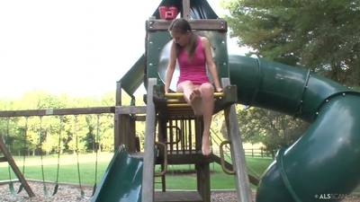 La jeune fille s'amuse bien dans ce parc public. La petite exhibitionniste ne porte pas de culotte, juste pour nous montrer sa chatte épilée.