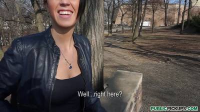Elle exhibe ses petits seins ronds dans la rue puis son petit cul délicieux, elle accepte de sucer la bite du mec tout en étant filmée en POV et se tourne pour baiser en levrette debout. Ils se font observer par les passants !