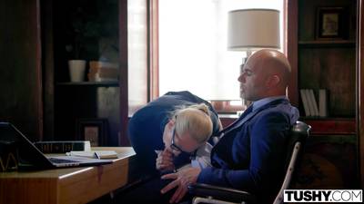 Pour se faire punir, son patron lui met des fessées et lui enfonce sa bite dans la chatte en levrette sur le bureau. ils se revoient ensuite chez le boss où AJ applegate se fera lécher la chatte faisant un facesitting
