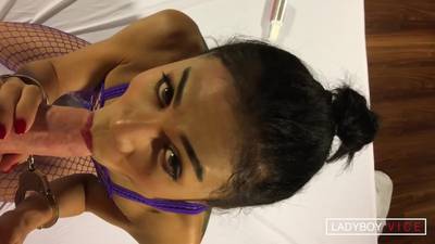La brunette a les mains attachées par des menottes pendant qu'elle suce la queue, elle cambre pour se faire baiser et prend une éjac sur elle