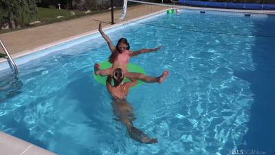 Stefanie Moon fait une séance photo à la piscine, pendant que Gina Gerson se baigne. Dans l'eau, les deux jeunes coquines s'amusent bien.