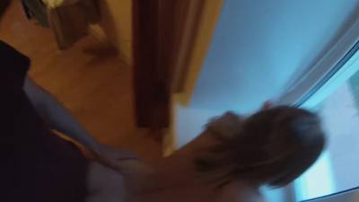 Son mec met sa copine devant la fenêtre toute nue et lui enfonce sa bite en levrette debout.